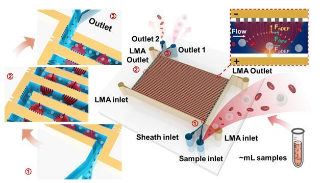 在生物技術、細胞生物學和生物醫(yī)學分析中,高效分離生物粒子至關重要。傳統(tǒng)使用標記的方法存在設備昂貴、耗時和對下游分析的潛在影響等問題。微流控領域中的介電泳(DEP)技術作為一種無標記方法,提供了一種可控、低損傷、低成本的分離方案。然而,介電泳技術長期受到兩方面限制,一是低通量的限制,難以滿足實際臨床樣本的大樣本量處理需求;二是多依賴于尺寸差異進行分離,難以分離尺寸相近的生物粒子。