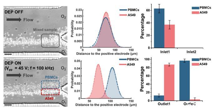 該芯片進一步用于分離各種混合樣品,充分展示了其獨特的能力和廣泛的可用性。這些樣品包括尺寸差異較明顯的MCF7癌細胞和小鼠紅細胞、尺寸相近的MCF7癌細胞和馬白細胞、尺寸基本一致的HeLa癌細胞和A549人肺癌細胞,展示出芯片具有優(yōu)異的基于介電性質(zhì)差異和基于尺寸差異的分離能力。特別地,在模擬血液中循環(huán)腫瘤細胞(CTCs)分離的實驗中,以尺寸相近的人體外周血單核細胞PBMCs和A549的混合樣品為例,根據(jù)兩種細胞的介電特性計算,選擇100 kHz作為工作頻率,使PBMCs受到負介電泳力,A549細胞受到正介電泳力。在實驗過程中,樣品流速保持在70微升每分鐘,圖4展示了芯片出口處在有無介電泳作用對比下的細胞流線和概率密度分布,印證了A549細胞與PBMCs連續(xù)高速分離效果,展示出巨大的臨床應用潛能。
