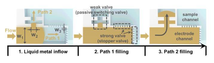 本工作利用毛細閥(CBVs)提供的強大被動流體控制能力實現(xiàn)液態(tài)金屬厚電極自組裝(圖2)。電極通道通過具有高閾值壓強的小孔與樣品通道連接,小孔作為截止閥防止液態(tài)金屬進入樣品通道。此外,每組電極行和列的交叉點處放置了中等閾值壓強的毛細閥結構,充當被動切換閥,能在液態(tài)金屬流動時自動改變路徑。根據(jù)所設計的結構,當液態(tài)金屬注入電極通道時會按照預設路徑自動填充滿電極通道,形成緊湊的大陣列液態(tài)金屬厚電極。由于每組電極在液態(tài)金屬填充過程中具有相同的結構和工作條件,因此電極數(shù)量可以無限擴展。