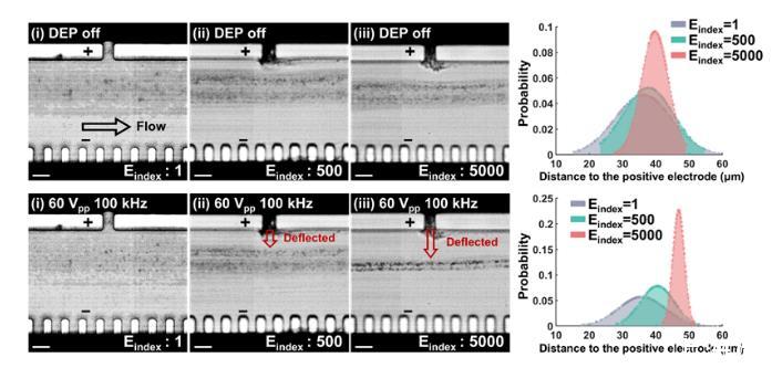 實驗證明,這種方法可以在拇指大小的空間中集成5000對液態(tài)金屬厚電極。在100微升每分鐘的高流速下,該芯片對流過5000對電極的PS微球產(chǎn)生顯著的介電泳累積作用(偏轉(zhuǎn)40微米),通量是同類技術的10倍;并具備基于粒子介電性質(zhì)差異與尺寸差異的高通量分離能力,突破了介電泳對于尺寸相近的粒子樣本難以分離的局限。