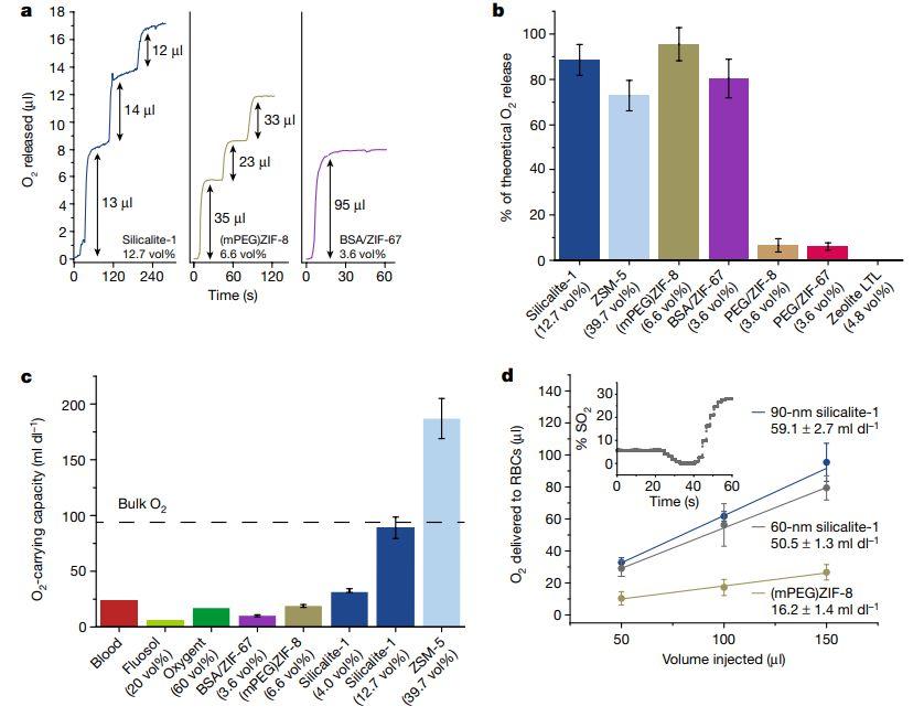 圖4、水和血液中的O2釋放測量。a)將氧化硅沸石、(mPEG)ZIF-8和BSA/ZIF-67納米晶體溶液注入脫氧水中的O 2釋放動力學。b)疏水沸石和MOF納米晶體的含氧水溶液相對于理論量的O2量,該理論量是通過假設氣體容量與固態測量值相當的完全干燥的孔隙計算。c)疏水性沸石和MOF納米晶體的水溶液的O 2攜帶能力與血液的O 2攜帶能力的比較。d)(mPEG)ZIF-8(6.7 vol%)和硅質鹽納米晶體(9.1 vol%和11.0 vol%60 nm和90 nm納米晶體,分別)作為注入溶液體積的函數。b–d中的誤差線表示與每個數據點的至少三個獨立測量值相關的標準偏差。