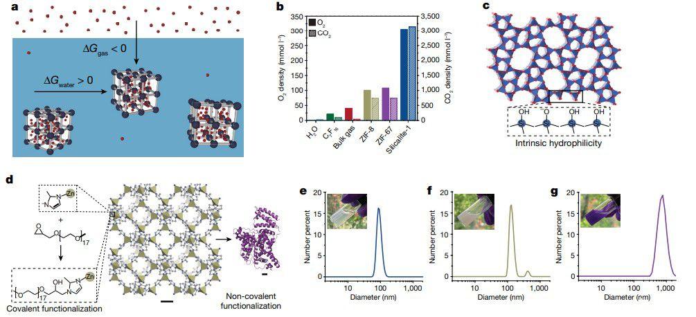 圖1、創建具有永久微孔的水性流體。a)設計微孔水的熱力學方法的圖解,由此具有疏水內表面和親水外表面的微孔納米晶體在水中形成穩定、均勻的膠體溶液,其中包含能夠吸附氣體分子的永久干燥孔。b)將兩種疏水性沸石咪唑酯骨架(ZIF)和一種疏水性沸石(silicalite-1)的O2和CO2吸附能力與純H2O(一種代表性的全氟化碳溶劑(C7F16)和本體氣相的密度。c)silialite-1的晶體結構(參考文獻42)。插圖說明了silialite-1的外表面如何被表面硅烷醇基團封端并且本質上是親水的。d,ZIF-8的晶體結構以及通過與親水性環氧化物反應的共價功能化和通過吸附蛋白質BSA(蛋白質數據庫代碼4F5S)的非共價功能化來增加其外表面親水性的策略。e-g,silialite-1(e)、(mPEG)ZIF-8(f)和BSA/ZIF-67(g)水溶液的DLS粒度分布。插圖分別顯示了納米晶體濃度為12 vol%、4 vol%和3 vol%的溶液照片。