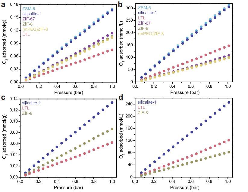 圖5、固態等溫線。固體狀態下25°C(a,b)和37°C(c,d)的O2吸附等溫線在重量和體積基礎上繪制。體積值是用晶體密度從重量值計算出來的。與可到達的表面積一致,通過比較ZIF-8和(mPEG)ZIF-8的等溫線可以看出,共價功能化對吸附O2的影響可以忽略不計。