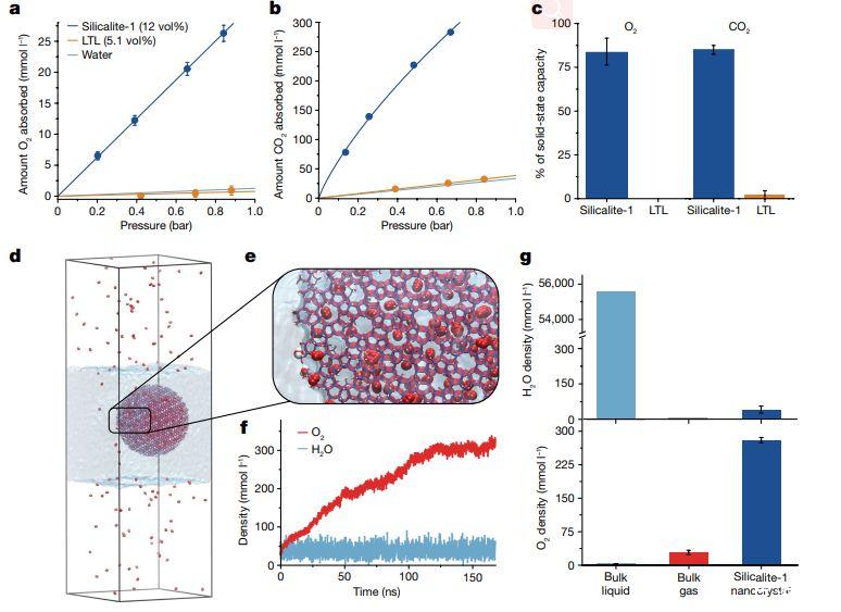 圖3、平衡氣體吸附等溫線和MD模擬。在12.2 vol%的硅沸石納米晶體水溶液(海軍藍)和5.1 vol%的沸石LTL納米晶體在水(橙色)中的溶液在25°C下O 2(a)和CO2(b)的氣體吸收等溫線。c)相對于沸石固態氣體容量,沸石納米晶體在水溶液中吸附的O 2和CO2的量。d)用于MD模擬的16.2×16.2×52 nm模擬盒的圖像。e)硅質鹽納米晶體邊緣的放大視圖。f)初始干燥的硅質鹽納米晶體內O 2和H 2 O的密度在模擬時間尺度上的變化。g)在模擬的最后50 ns期間,在體液相、體氣相和硅質巖1納米晶體中H 2 O(上)和O 2(下)的平均濃度。
