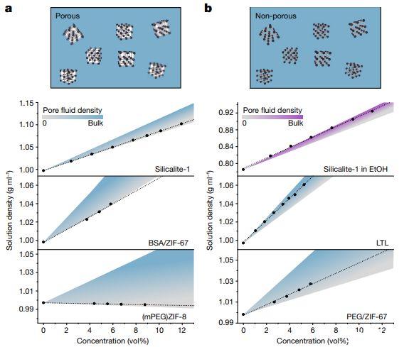 圖2、用于評估水溶液孔隙率的密度測量。a)硅石-1、BSA/ZIF-67和(mPEG)ZIF-8納米晶體的膠體溶液在水中的密度與含有干孔的微孔流體一致。b)相比之下,硅質鹽納米晶體在EtOH和沸石LTL和PEG/ZIF-67納米晶體在水中的膠體溶液的密度與沒有可及孔隙率的流體一致。