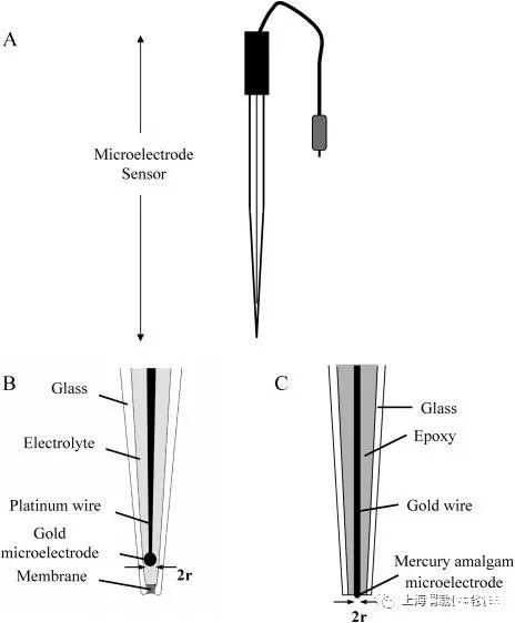 圖1、具有雙用途的“微電極”及作為電化學傳感器示意圖。圖(A)表示的是一種微小的傳感表面,通常位于玻璃的尖端區域毛細管結構(B和C)。圖B、C分別表示的是O2微電極和金-合金組成的尖端微電極。微電極的應用需要在一個完整的電化學電池中測量電流的設備,這些組件被認為是一個更大的分析系統的一部分,而不是傳感器的一部分。