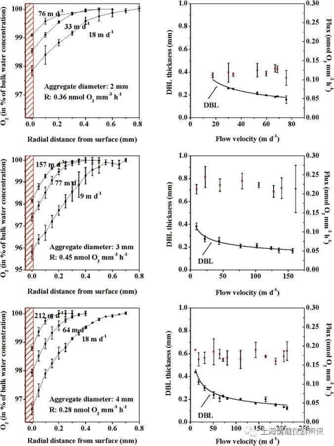 圖5、通過對三種不同下沉速度下獲取的海洋聚集體(沉積物)氧的徑向分布方程的模擬圖(左圖),以及同一團聚體中DBL厚度和氧通量作為下沉速度的函數(右圖)。每個測量點表示的是一個測試數據平均值。