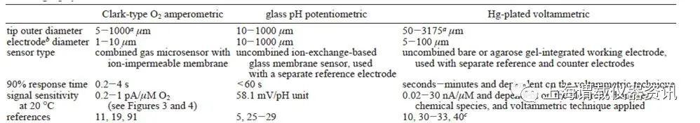 圖3、三種類型的單微電極傳感器的技術參數,已廣泛應用于化工領域和海洋學研究領域