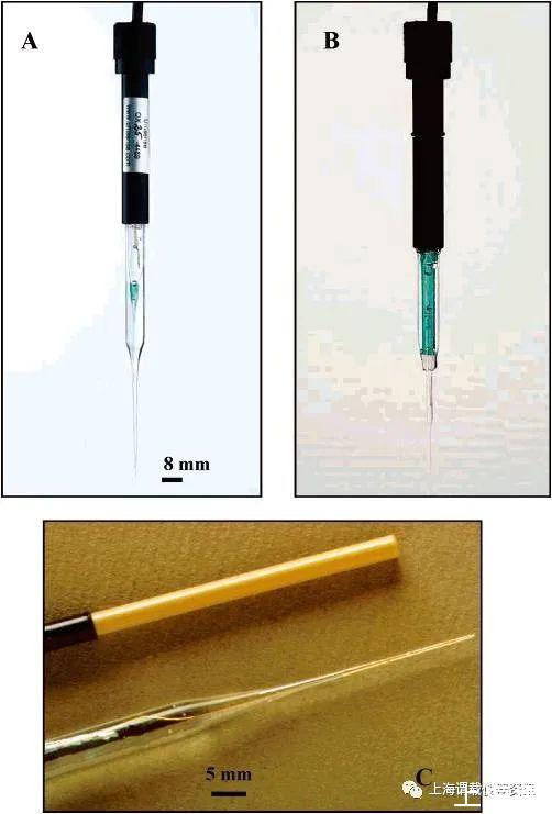 圖2、圖a表示的是Clark-type氧微電極。圖b表示的是pH玻璃微電極構型示意圖,圖c表示的是在聚醚醚酮和玻璃毛細管中構建出的伏安電極。