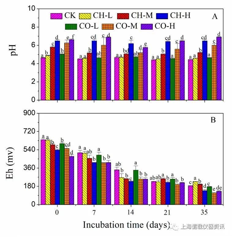 圖1、pH(A)和氧化還原電位Eh(B),歸一化至標準氫電極)在土壤中不同時間內分批實驗處理。所示數據為平均值±SD(n=3)。柱上不同字母表示處理間差異顯著。