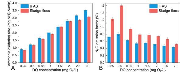 圖2、(A)在硝化批測試中,IFAS系統和獨立絮體在不同溶解氧水平下的氨氧化速率(AOR)和(B)N2O EF。誤差條代表三次重復測試的標準偏差。圖2A所示,IFAS(從0.89±0.06至3.52±0.07 mg N/min)和污泥絮體(從0.84±0.01至3.08±0.02 mg N/min)的氨氧化率(AOR)顯著增加隨著DO濃度的增加(從0.25到3 mg O2/L),前者的增加率幾乎保持不變,而后者的增加率卻下降。圖2B中IFAS系統的N2O EF從DO濃度0.25 mg O2/L時的(0.73±0.02)%增加到(0.80±0.04)%當DO濃度為0.5 mg O2/L時,隨著DO濃度的增加(0.5-3 mg O2/L)緩慢下降至(0.44±0.02)%。單獨污泥絮體也呈現出類似的趨勢,其最高N2O EF達到(1.60±0.05)%。