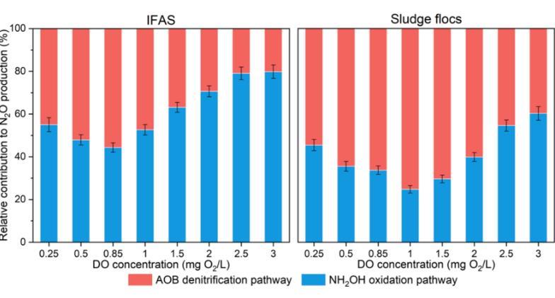 圖3、在硝化批測試中,AOB反硝化和NH2OH氧化途徑對N2O產生的相對貢獻在不同溶解氧水平下的情況。誤差條代表三次重復測試的標準偏差。
