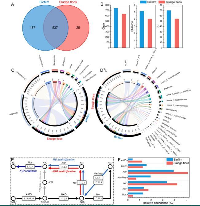 圖5.生物膜和絮體的微生物群落多樣性和組成:(A)Venn圖,(B)Alpha多樣性比較,(C)以圓形圖形式可視化的屬和屬水平的系統發育分類群的分布。(D)與N2O轉化相關的氮代謝KEGG通路和(F)關鍵酶的預測相對豐度。