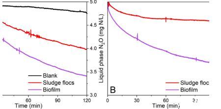 圖4、反硝化批測試中的液相N2O曲線:(A)僅添加N2O,(B)N2O和亞硝酸鹽共存。顯示了添加或不添加亞硝酸鹽時液相N2O的變化。4A所示,在存在生物膜和污泥絮凝物的情況下,N2O濃度在120分鐘內分別降低了1.61和1.03 mg N/L。然而,添加亞硝酸鹽后,生物膜的N2O濃度下降至1.34 mg N/L,而污泥絮體的N 2 O濃度僅下降0.42 mg N/L(圖4B)。