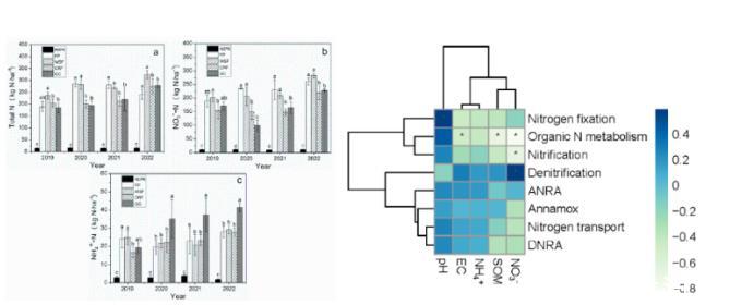 研究結(jié)果表明,施用無(wú)機(jī)氮肥的各處理,總氮淋溶率占總氮肥投入量的16.5%~30.7%;在同等施氮量的情況下,水溶肥處理的氮淋失率最高(20.2%~29.0%),而生草處理和包膜尿素處理的氮淋失率顯著較低(分別為17.0%~24.9%和15.2%~24.5%)。果園栽培過(guò)程中,氮素循環(huán)相關(guān)基因豐度顯著下降(17.1%~18.8%),但在組成上沒(méi)有明顯變化;樹(shù)脂包膜尿素處理和傳統(tǒng)農(nóng)民施肥處理的N2O排放風(fēng)險(xiǎn)相關(guān)基因豐度最高;土壤pH值、土壤速效氮、有機(jī)質(zhì)和電導(dǎo)率對(duì)土壤關(guān)鍵氮循環(huán)功能的影響呈負(fù)相關(guān)。該研究為建立果園的配套應(yīng)用技術(shù)、優(yōu)化施肥策略提供了數(shù)據(jù)支撐。