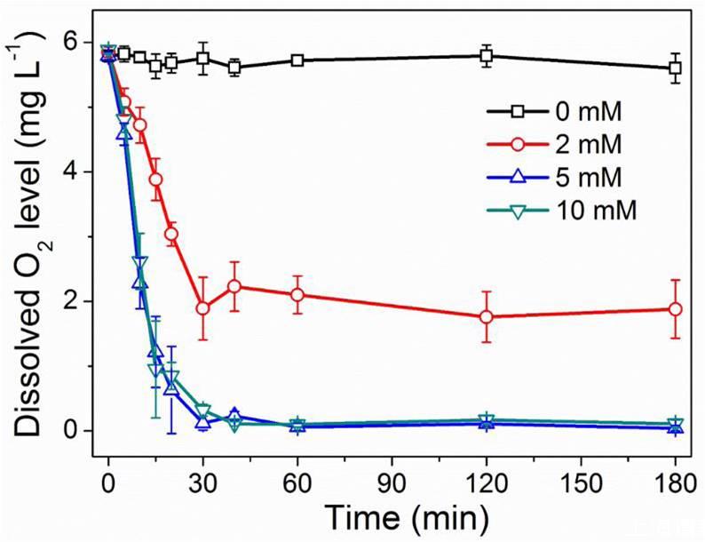 圖6、酸化的DMEM營養(yǎng)基中(pH=6.5)加入不同濃度(0 mM、2mM、5mM、10mM)的脫氧劑MS-NPS后,體系中氧氣濃度隨時(shí)間的變化情況。從圖中可以看出,脫氧劑MS-NPS加入會(huì)引起體系中的氧氣濃度迅速降低,在30分鐘后,體系中的氧氣濃度就處于平衡了,而脫氧劑MS-NPS的濃度越大,體系中的氧氣濃度越小。但是當(dāng)脫氧劑濃度增加到一定濃度時(shí)(10mM),其氧氣濃度就幾乎不變了。
