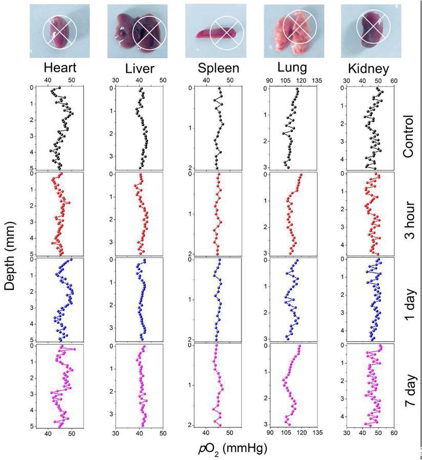圖8、昆明小鼠中注射高劑量MS NPs(100mg/L)和未注射MS NPs不同組織器官(心臟、肝、脾臟、肺、)的在不同時(shí)間段微表面氧分壓剖面分析圖。從圖中可看出,老鼠各器官組織中的氧分壓值未出現(xiàn)較大的波動(dòng)。