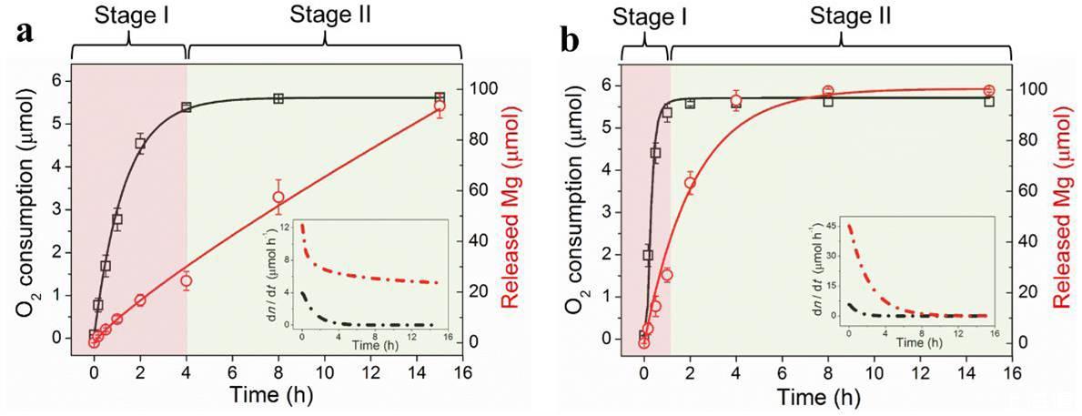圖7、在不同pH(4.5(a)、6.5(b))環(huán)境下,老鼠體內(nèi)注射硅化鎂-聚乙烯吡咯烷酮溶液(MS NPs)后,MS NPs與腫瘤血管內(nèi)的氧氣進(jìn)行反應(yīng)時(shí),老鼠腫瘤體內(nèi)的氧氣消耗以及鎂的釋放濃度隨時(shí)間的變化情況。插圖表示的是使用MS NPs后氧氣消耗率以及鎂的釋放率隨時(shí)間的變化分析。