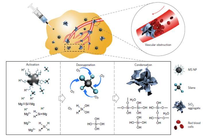 快速吸收分子氧的材料(稱為除氧劑或脫氧劑(DOA))具有許多工業(yè)應(yīng)用,例如:食品保藏、金屬防腐蝕和煤脫氧。由于氧對(duì)癌癥生長至關(guān)重要,所以通過消耗腫瘤內(nèi)氧氣的饑餓療法是治療癌癥的潛在有效策略。本論文研究了如何應(yīng)用注射聚合物改性硅化鎂(Mg2Si)納米粒子,用于清除腫瘤中的氧氣并形成副產(chǎn)物阻止腫瘤毛細(xì)血管再氧化。相關(guān)研究結(jié)果表明在酸性腫瘤微環(huán)境中,Mg2Si釋放出的硅烷可以有效地與溶解組織和血紅蛋白結(jié)合的氧三者反應(yīng)形成二氧化硅(SiO2)聚集體,并且這種原位構(gòu)造的SiO2會(huì)阻斷腫瘤毛細(xì)血管并防止腫瘤接受新供應(yīng)的氧和營養(yǎng)物。
