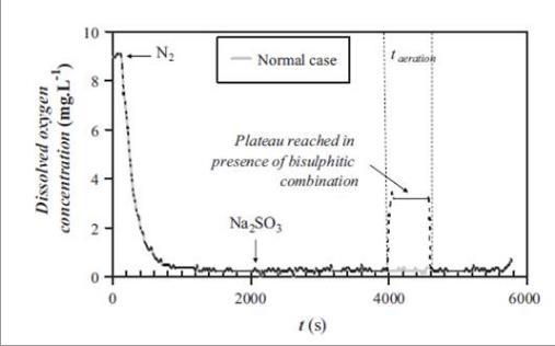圖3、實驗過程中溶解氧濃度隨時間變化情況。采用亞硫酸鹽靜態法測試體積傳質系數(kLa)。從圖中可以看出,當體系中充入氮氣后,水溶液中的氧氣呈現明顯的下降趨勢。