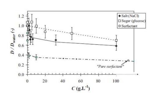 圖5、合成液體介質中氧的擴散系數的比值。指的是純凈水中加入一定濃度的化合物(鹽-□;◆-表面活性劑;○-糖;)的氧的擴散系數(T=20?C)。虛線線和實線的曲線是通過方程擬合獲得(15)和表3所列的相關系數進行建模獲得的。