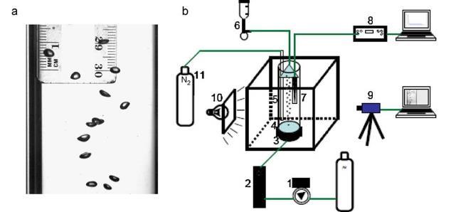圖2、(a)產生一系列氣泡的圖解。(b)用于測量與后一列火車有關的液體側傳質系數的實驗裝置(1)壓力表、(2)氣體流量計、(3)電子壓力計、(4)方形罐、(5)膜噴器、(6)氣泡柱、(7)皂膜儀、(8)化學溶液容器,(9)氧微傳感器,(10)采集系統(攝像頭,電腦),(11)氮氣壓力表,(12)攪拌系統