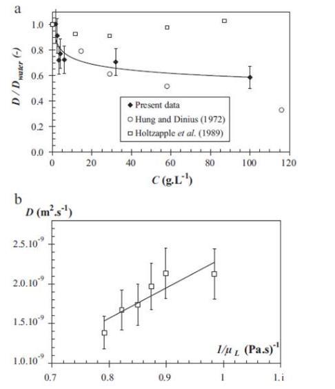 圖4、(a)含有鹽的水溶液中氧擴散系數的對比(實際測試與文獻報道的比較)。(b)葡萄糖水溶液的氧氣擴散粘度系數與粘度倒數的關系。