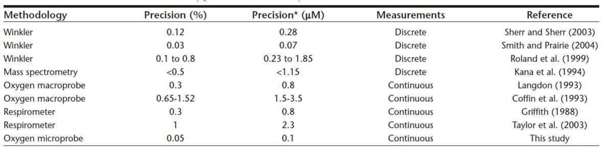 圖6、測量浮游環境中氧濃度的不同方法的精確度對比,從表中可以看出,使用卡拉克型的氧氣微電極測試水體中氧弄的方法精度較好,幾乎和Winkler法的精度相識,而且卡拉克型氧微電極測試水體系中的氧具有響應快的特點。
