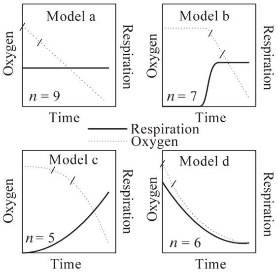 圖4、表示采用不同模型法對應的氧濃度隨時間的變化情況以及呼吸速率隨時間的變化情況。n代表本研究中觀察到的相應病例數。圖中的兩條線表示的是間隔時間(5h)內用于計算細菌呼吸速率值。對于模型b和模型c,起點是從最小值(氧濃度為0.5μM)開始。