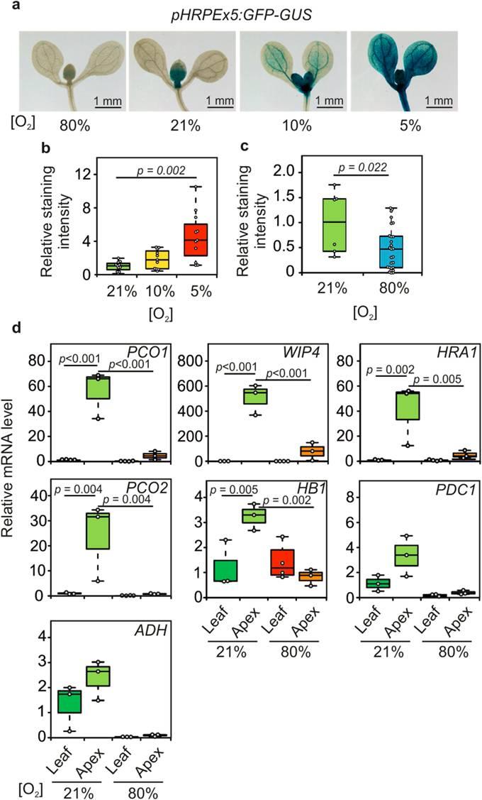 圖3、植物莖尖低氧條件下誘導分子缺氧反應研究。圖a表示的是一種由5個重復的HRPE報告基因組成的合成結構對氧的響應性。圖b表示的是pHRPEx5:GFP-GUS基因在21%、10%和5%O2下的對應的相對染色強度的定量分析。圖c表示的是pHRPEx5:GFP-GUS基因在21%和80%O2下的對應的相對染色強度的定量分析。此研究結果表明,該結構能有效地反映植物組織處的氧狀態。圖d表示的是采用RT-qPCR檢測缺氧誘導基因的表達。