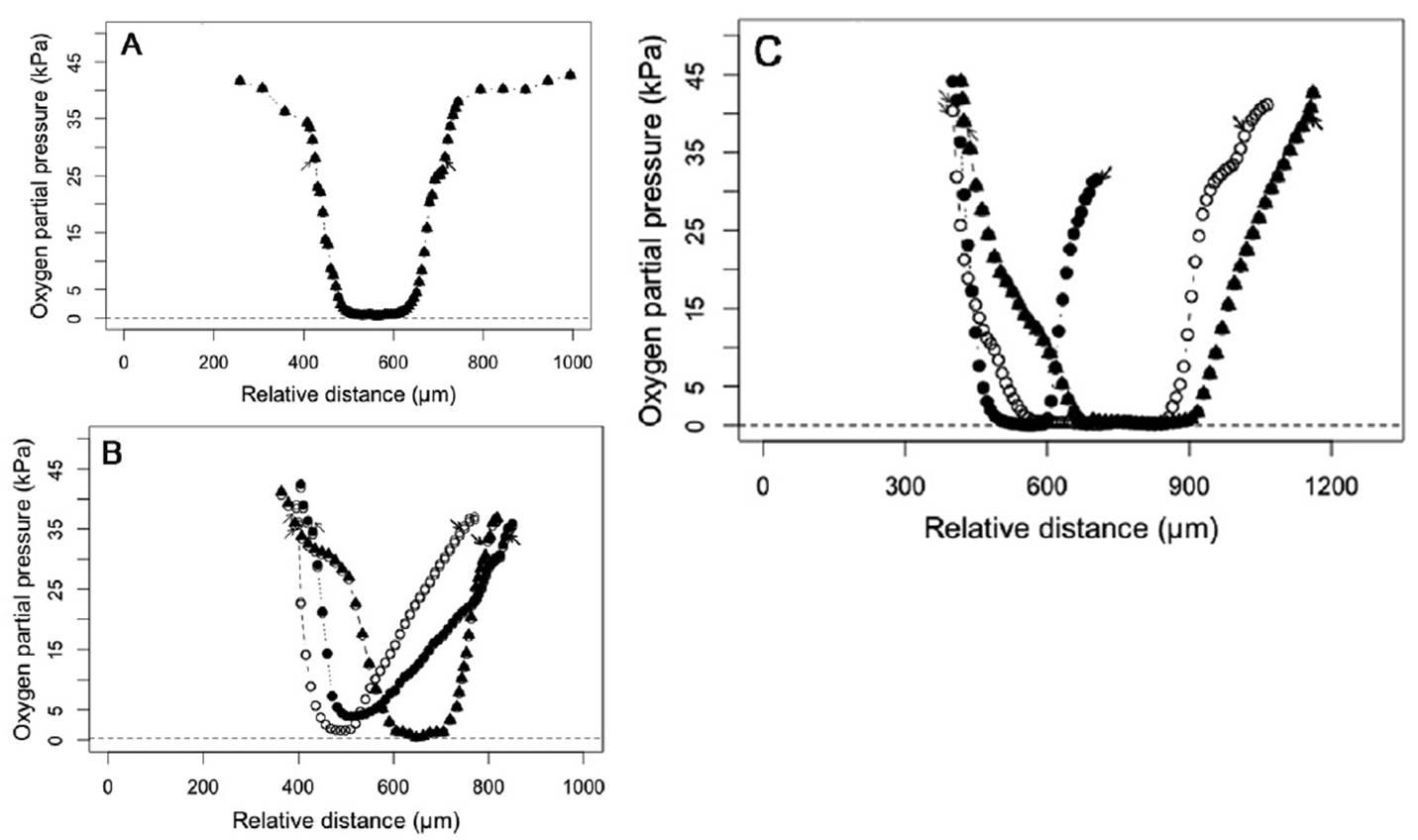 圖2、黑翅土白蟻主要腸腔室的氧分壓的徑向分布。圖A表示的是黑翅土白蟻腸道系統從腸壁到腸隔室中心的徑向氧含量分布。圖B表示的是黑翅土白蟻中腸中間的氧濃度從腸壁到內腔中心的變化情況。●(前腸)△(中腸)○(中腸的后半部分)圖C表示的是腹和結腸(后腸)區域內的氧分壓分布情況。●(前腹)△(后胃)○(后腸)。
