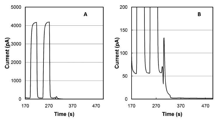 圖2、STOX傳感器的前陰極的開(kāi)關(guān)周期的信號(hào)值,測(cè)量的第一個(gè)點(diǎn)是空氣飽和水,然后在加入了抗壞血酸鈉的缺氧溶液(A)。在低電流下的信號(hào)被詳細(xì)地顯示出來(lái)(B),說(shuō)明在這種情況下,STOX傳感器前陰極去除O2的效率大概只有98.7%。