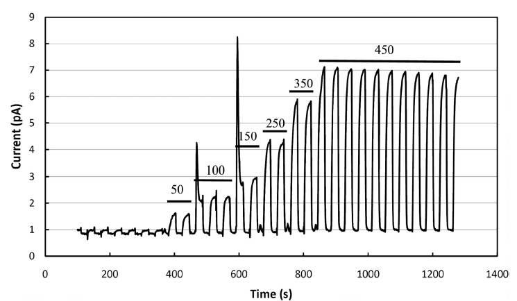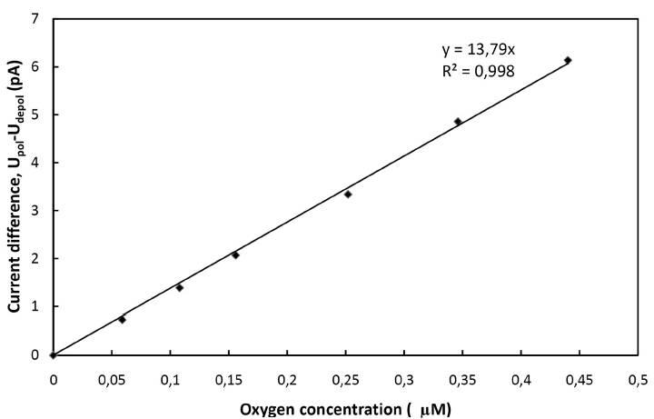 圖4、校準(zhǔn)過(guò)程中獲得的校準(zhǔn)曲線。校正曲線校正初始濃度為10nm,O2在抗壞血酸鹽溶液中的指數(shù)衰減。圖中所示的傳感器電流值是帶有前保護(hù)開(kāi)和關(guān)的之間形成的信號(hào)差值。