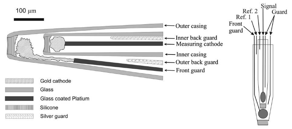 圖1、左半邊圖表示的是STOX微電極傳感器前端示意圖,右半邊圖顯示的是STOX傳感器中的所有陽(yáng)極和陰極部分的構(gòu)造圖。