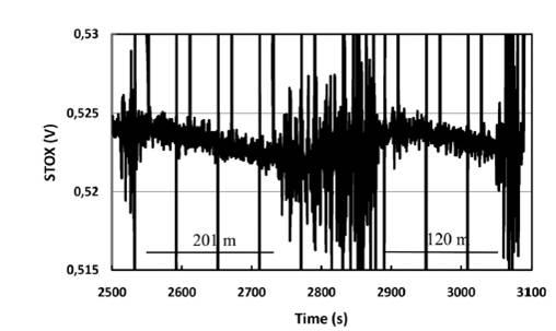 圖8、高度放大的STOX信號(hào)(對(duì)應(yīng)的總尺度為0.015 V),對(duì)應(yīng)電流為1.5 pA或160 nM O2),深度分別為201和120 m。圖中2740至2890秒處產(chǎn)生的高噪音是由于設(shè)備浮于水面引起的振動(dòng)。