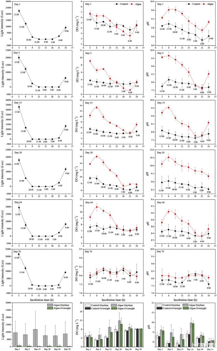 圖2、在一個完整的一晝夜的循環(huán)周期中,控制池和藻類處理池的水柱樣品中光強度、DO和pH值的變化情況。白天和夜間的所處的時間段分別指的是從早上6點到下午18點,從下午18點到早上6點。分別給出這些時間段測試出的光強度、DO和pH值(所有的測試值為三次重復(fù)測量的平均值)