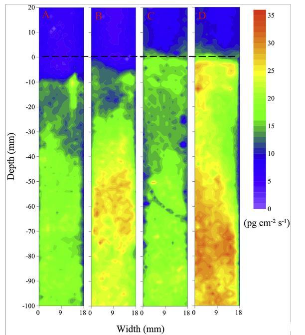 圖5、應(yīng)用DGT法對進行對比組水體和沉積物和藻類處理的水體和沉積物測試獲得的不穩(wěn)定S(-II)濃度的二維分布圖。圖A和B分別)分別在第44天、日間及夜間時間段對應(yīng)的對比組水體和沉積物和藻類處理的水體和沉積物中的不穩(wěn)定的S(-II)濃度;圖C和D分別表示的是在第44天時藻類處理沉積物中白天和晚上的不穩(wěn)定的S(-II)濃度。