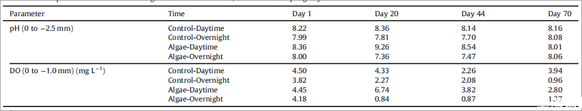 圖3、對比參照沉積物樣品和藻類處理后的沉積物樣品在白天和夜間不同時間段的pH值和DO值,深度為0對應(yīng)水平虛線表示的是沉積物-水界面(SWI)。所有測試給出的值為三次重復(fù)測量的平均值。