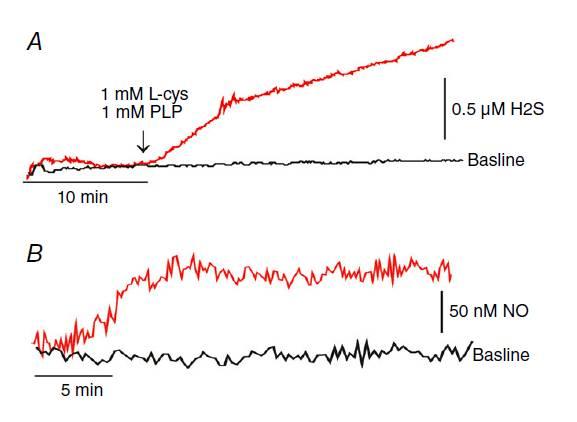 圖1、老鼠胃底平滑肌所產生硫化氫和一氧化氮。其中圖A的紅色曲線代表的是胃部基底組織中L-半胱氨酸和吡哆-5-醛磷酸鹽作用產生的硫化氫濃度。圖B中的紅線表示的是追蹤胃部組織中未加任何物質所產生的一氧化氮的濃度。黑色的基線表示的是在空白的測試,即測試系統中無胃部組織物質。