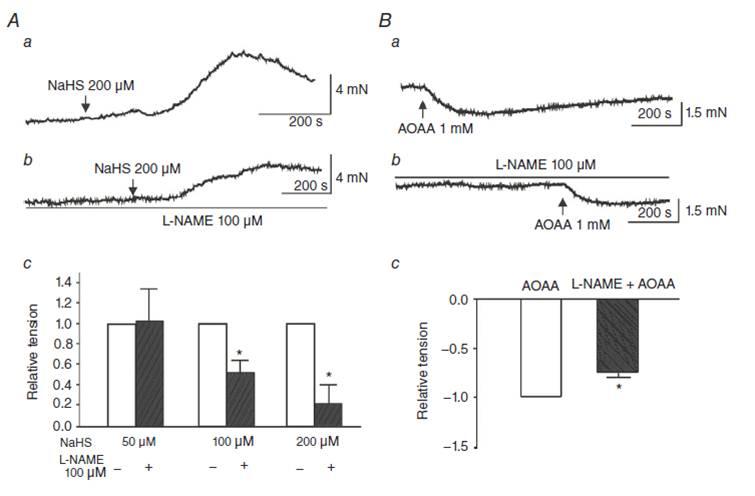 硫氫化鈉作為硫化氫的給體,能夠增強基底平滑肌肉張力,SNP作為一氧化氮的給體,能夠降低基底部平滑肌肉張力,這兩種物質都表現為劑量依賴性。硫氫化鈉導致平滑肌肉張力增加是因為其抑制了L-精氨酸甲酯(一氧化氮合成酶抑制劑)。氨氧基乙酸(AOAA),作為胱硫醚-β-合成酶抑制劑,對于平滑肌張力產生抑制作用,這些作用也會被L-精氨酸甲酯抑制。而一氧化氮的產生則會因AOAA的存在顯著地增強。內皮型一氧化氮合成酶(eNOS)在1177序列位置處磷酸化以及蛋白激酶在序列308處磷酸化和蘇氨酸在473處磷酸化過程都被產生的硫化氫鈉所抑制。LY294002(一種磷脂酰基醇三激酶抑制劑)能夠阻止硫氫化鈉調節帶來的影響。而序列1177處磷酸化的內皮型一氧化氮合成酶、序列308處磷酸化的蛋白激酶和在473處磷酸化的蘇氨酸會因AOAADE存在而顯著的增強。胱硫醚β-合成酶siRNA產生的干擾會增加eNOSde蛋白的表達水平但是并不會改變蛋白激酶的表達水平。這些結果說明硫化氫導致的胃部平滑肌張力的增強是因為抑制了磷酸肌醇酰胺3激酶代謝產生的一氧化氮。