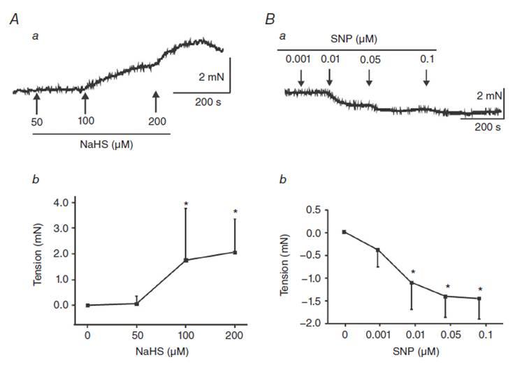 圖2、內源性硫化氫和一氧化氮對于胃部平滑肌張力的影響。圖Aa表示的是追蹤不同濃度的硫氫化鈉對于胃部平滑肌張力的變化。圖Ab表示的是具體不同濃度的硫氫化鈉對應于胃部平滑肌張力值,從圖中可以看出,硫氫化鈉的濃度越高,對于的胃部平滑肌的張力越大。圖Ba表示的是追蹤不同濃度的SNP對于胃部平滑肌張力的變化,圖Bb表示的是具體不同濃度的SNP對應于胃部平滑肌張力值,從圖中可以看出,對應的SNP濃度越大,胃部組織平滑肌的張力越小。