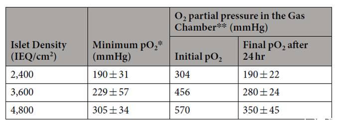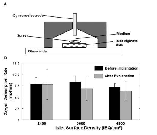 研究了細胞移植在一個可回收的封閉裝置中(裝置中包含藻酸鹽平板上的胰島,其表面的氧氣濃度是超正常生理水平的)的胰島存活能力和功能。胰島密度高達4800 IEQ/cm2,在初始階段保持了胰島的可行性和功能性,胰島所處的環境是氧分壓(pO2)為570mmHg的氣室。這是第一次成功的演示植入如此高密度的組織。在植入前和移植后使用一種新的OCR檢測方法顯示接近90%胰島的生存能力得到保存。這也是第一個定量保存胰島活力的封裝系統。此案例對異種胰島和干細胞分化產生的胰島細胞也將享受類似的好處。