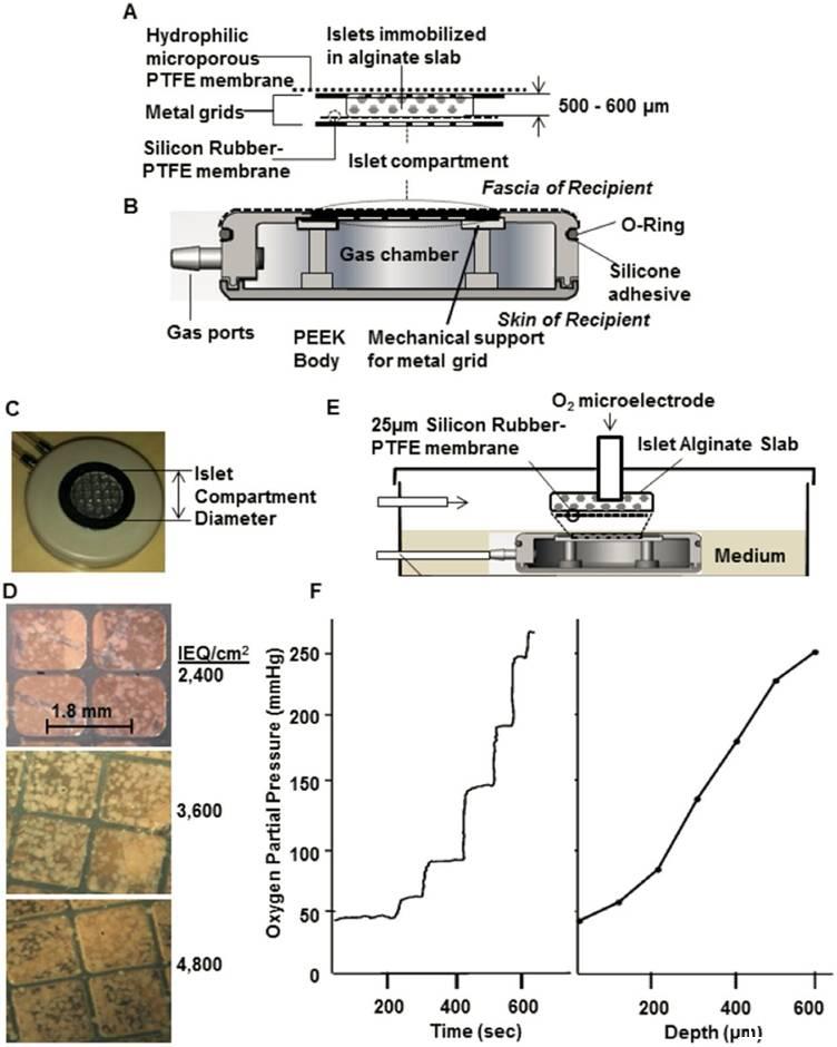 圖1、用于測量板內氧氣剖面的空氣裝置和系統。圖A表示的是胰島細胞嵌入兩側不銹鋼網格的厚度為500-600μm海藻酸鹽中,外表面與充滿海藻酸鹽的聚四氟乙烯膜表面,界面處是組織細胞,內部面被透氧硅橡膠聚四氟乙烯膜覆蓋。圖B表示的是PEEK外殼包括氣室和兩個連接到皮下植入組織的接入端口。圖C表示的是表面密度為2400個胰島當量/cm3的空氣裝置頂視圖。圖D表示的是頂部表面的設備具有不同密度的胰島,胰島下方可見頂部金屬網格。圖E表示的是在改裝的氣體裝備中胰島艙體的氧濃度剖面。圖F表示的是平面藻酸鹽板內典型的氧濃度剖面圖。