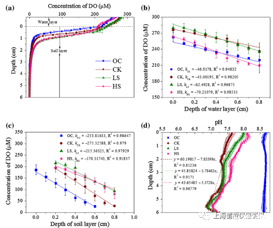 圖1、原位溶解氧(a),水層(b)和土壤(或沙/土混合)層(c)線性區(qū)域的擬合,原位pH(d)作為土壤MFC深度的函數(shù)。OC-開路控制,無沙塵。隨著深度的增加,所有樣品中的DO濃度均降低(圖a所示)。表層土壤的DO(深度0-1厘米)顯示出在水層中更快的下降。DO的擴(kuò)散系數(shù)(Ds)隨著添加的沙量的增加而增加。與開路控制的土壤pH相比,所有活性MFC(CK,LS和HS)的pH(平均值)降低了1.1-1.4個單位(圖d所示)。