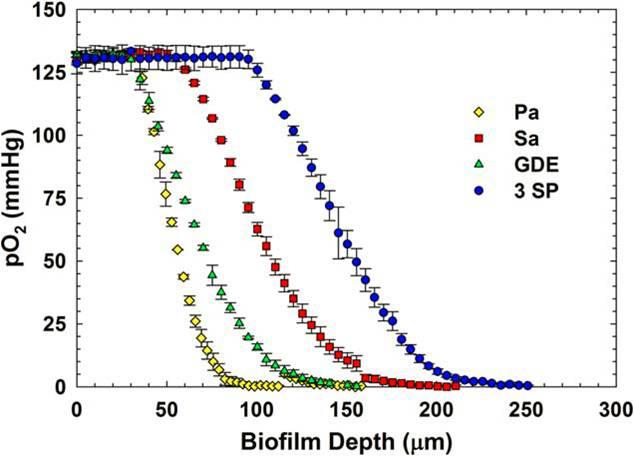 圖1、人慢性創面分離標本在體外形成的細菌生物膜中氧濃度分布。深度標度為零是自自行設定的(位于生物膜的上方),微電極傳感器的測量始于生物膜的上方,然后將微傳感器放入生物膜中。當微電極傳感器穿透生物膜時,生物膜內的氧濃度開始下降。每個剖面文件是在三到四組獨立的測量數值,誤差范圍表示與平均值的標準差。生物膜是由綠膿桿菌、金黃色葡萄球菌、GDE、糞腸球菌、銅綠假單胞菌、金黃色葡萄球菌、糞腸球菌等組成的。不論生物膜的種類組成如何,都測量了相似的生物膜的氧濃度剖面。