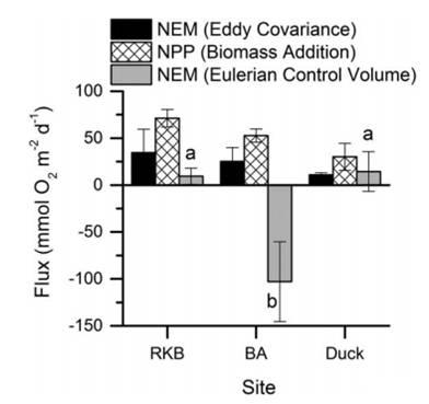 圖4、通過渦動協(xié)方差,生物量添加和歐拉控容積法計算的各部位的凈代謝率。渦度協(xié)方差和生物量添加技術顯示了佛羅里達灣生產率梯度上的預期趨勢。生物質添加和渦流技術之間的比率>2:1是因為生物質添加技術僅包含海草呼吸作用和地上生產,而渦旋協(xié)方差技術包含海草草甸中存在的所有生物。用歐拉技術測定的NEM速率有顯著差異,但在佛羅里達灣的營養(yǎng)梯度范圍內未顯示出預期趨勢。