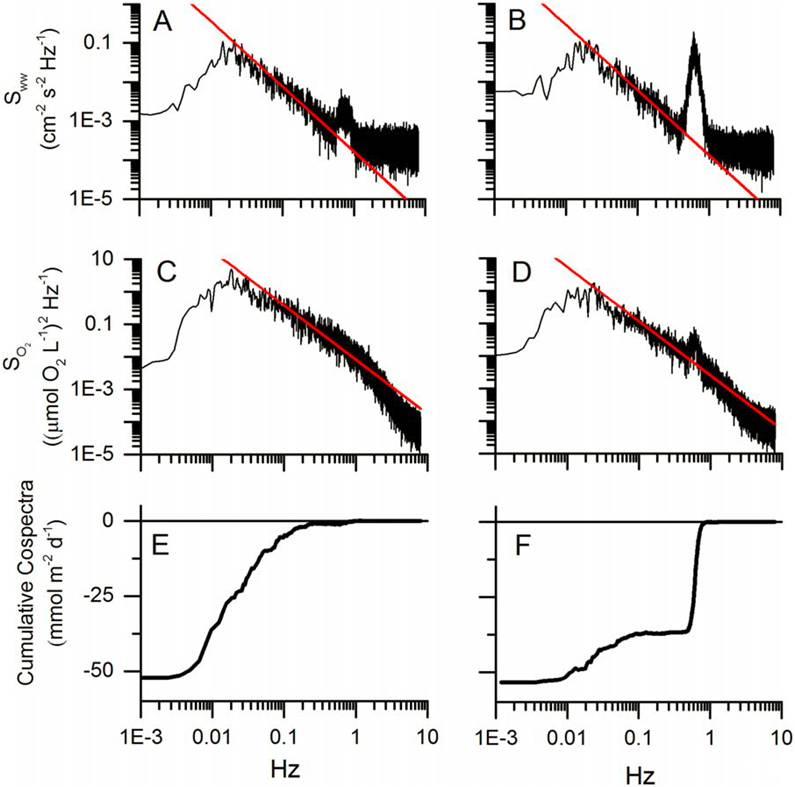 圖5、渦流協(xié)方差測量主要受電流(左)和波動(右)的影響。垂直速度的光譜表明,這兩個電流流動為主的條件下(圖5A)和波為主的條件下(圖5 B)存在在不同的時間,這也與O2光譜一致(圖5 c和5 d)。所有光譜均顯示出定義明確的慣性子范圍,其特征是-5/3斜線。波浪主導的周期在0.5-1 Hz頻帶內顯示出明顯的波浪信號,表明表面波較小。電流主導周期中的累積共譜表明,在更寬的頻帶(0.002-0.9 Hz;圖5E)中,通量貢獻較大;而在波浪頻率中,以波浪為主的周期中,通量貢獻更大(圖5E、圖5
