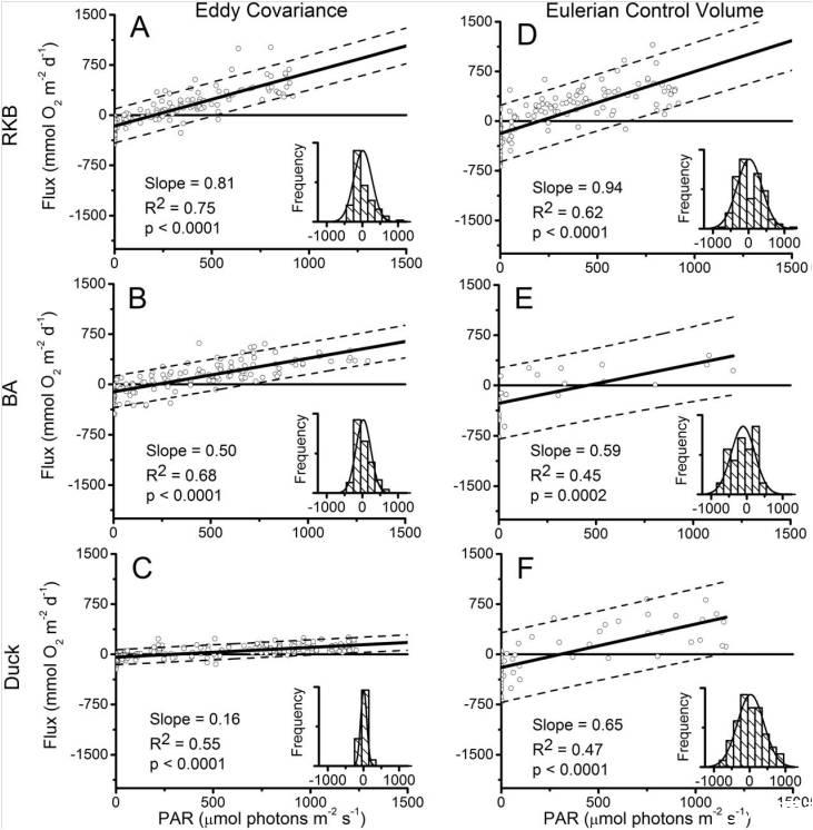 圖2、所有渦度協(xié)方差(A、B和C)和歐拉控制體積(D、E和F)的逐時盒圖,每個站點在一天中的每小時O2通量數據。圖3e和3f中的數據減少是由于低電流速度減少了歐拉技術的響應時間(BA和DUCK監(jiān)測點在3h間隔的通量率)。圖中的方框表示上四分位數和下四分位數,每個框中的線表示中位數,線表示第一個離群值,圓表示離群值。圖3e和圖3f中減少的數據是由于低流速減少了歐拉技術的響應時間(BA和Duck站點每隔3小時的通量率)。n是個體通量估計值的數量。PAR是測量期間內的平均光合有效輻射。