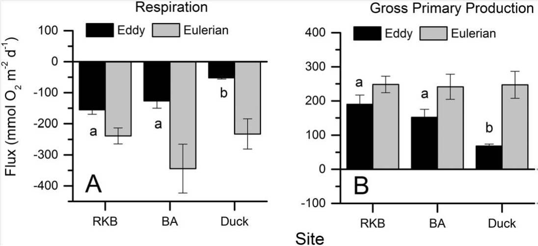 圖3、左圖顯示了通過渦度協(xié)方差技術和歐拉控制體積法得出的各部分的呼吸(R)速率。右圖通過渦度協(xié)方差和歐拉方法顯示了各個站點的總初級生產(GPP)率。從圖中可以看出,在對24小時內的EC(渦度協(xié)方差技術)通量進行積分顯示,GPP和R的速率在各個位點之間存在顯著變化。