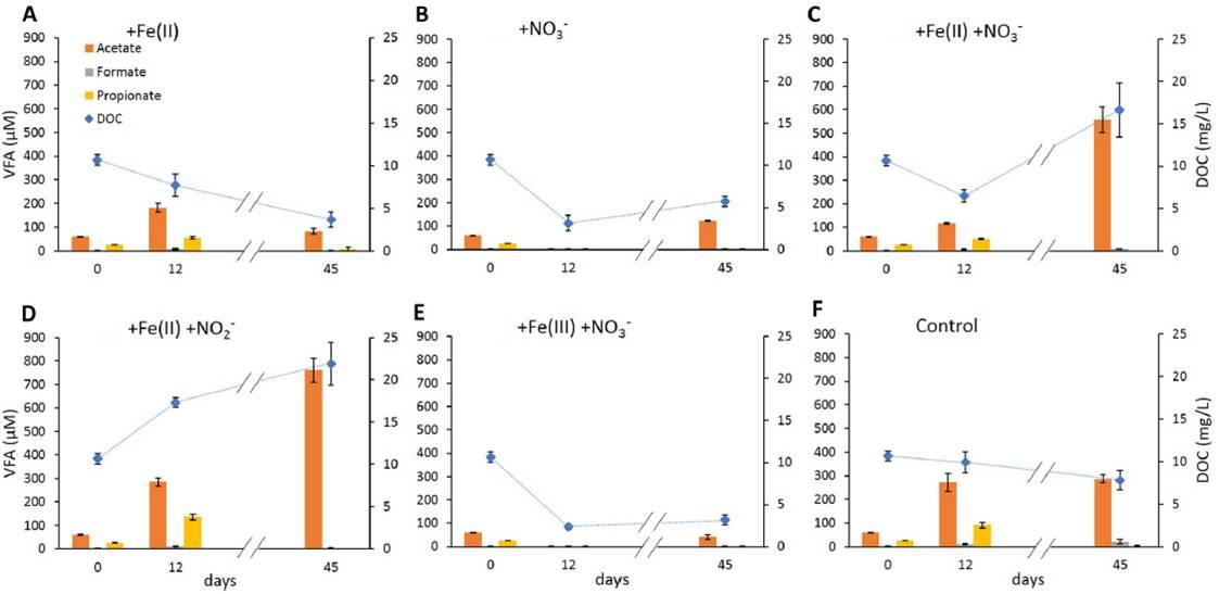 圖4、隨著時(shí)間的推移,體系中溶解的有機(jī)碳(藍(lán)色鉆石符號(hào))和揮發(fā)性脂肪酸(棒)的濃度在設(shè)置的不同微觀環(huán)境體系中隨時(shí)間的變化情況。
